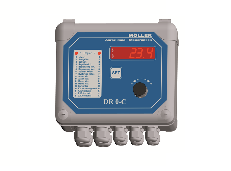 Síťový digitální regulátor lze použít pro řízení klimatu ve dvou odděleních a jedné chodbě. Regulátor se používá pro řízení jak jednoduchého systému odtahu vzduchu, tak pro centrální odtah vzduchu. Regulátor je jednoduchý na ovládání, používá jeden otočný knoflík a jedno tlačítko. Pomocí dvoudrátového síťového vedení lze propojit DR 0-C s různými komponenty, které umožňují pohodlné ovládání stabilního klimatu ve stáji.