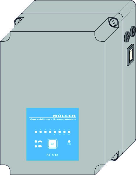 Vícestupňové řízení ST8/12 je určeno pro signál řídícího napětí 0-10 V. Ventilátory jsou připojeny v 8 stupních, popř. dvě skupiny ventilátorů ve 12 stupních. Pro obě ventilační skupiny je k dispozici jeden spínací kontakt pro pomocné vinutí. Řízení disponuje jedním reléovým kontaktem pro uzavírací klapky 2. skupiny ventilátorů a jedním regulačním napěťovým kontaktem 0-10 V pro škrticí klapky 1. skupiny ventilátorů.