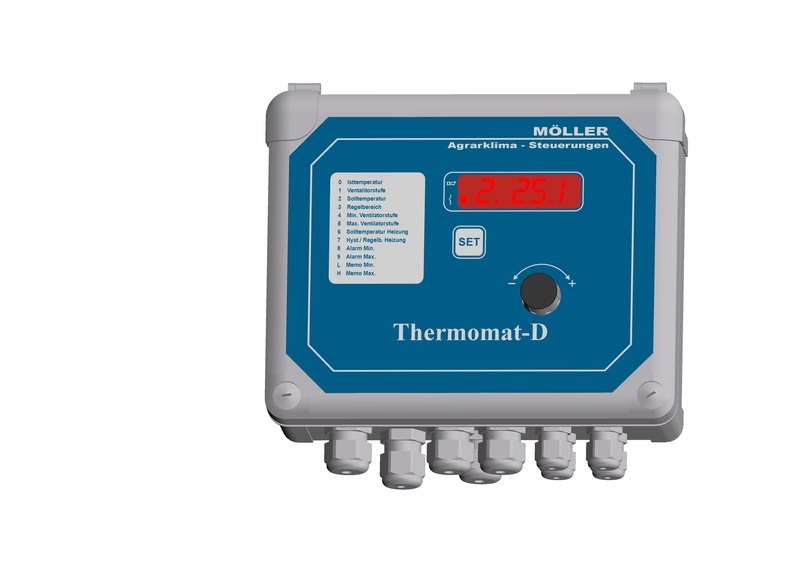 Thermomat-D je digitální 5-ti stupňový termostat. Jednotlačítkové ovládání umožňuje jednoduché a přehledné nastavení Thermomatu. Zařízení je možné připojit přes LON sběrnici do PC, v němž lze všechny načtené hodnoty z Thermomatu ukládat a měnit.