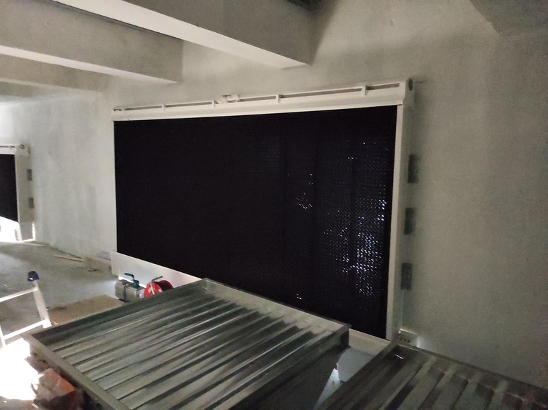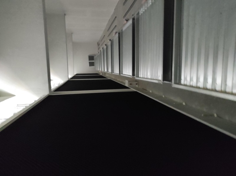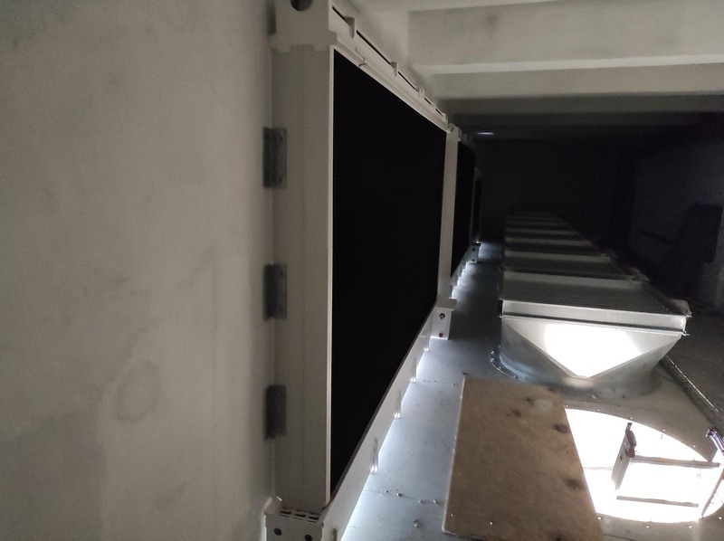 Na fotkách jsou zachyceny voštinové chladiče, které jsou umístěny ve stěně budovy.